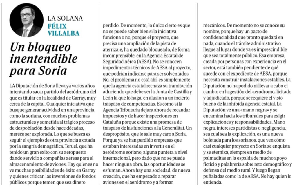 Siento discrepar en alguna de las cosas que dices y me sorprende que, como dices al final, no entiendas la situación del aeródromo y por qué algunos dudamos de que el verdadero interés de algunos sea el bien de Soria y el interés social, excusas que no se pueden discutir, sobre todo si vienen anunciadas con puestos de trabajo, aunque sea uno, así que, en la confianza que nos tenemos desde hace tiempo, trataré de explicártelo, o al menos, darte un punto de vista diferente, más crítico, más por el verdadero interés del pueblo de Soria y del interés social, aunque no emane en este caso de un político, si no de un mero Soriano, que tiene derecho a reclamar el bien de Soria y el interés social aunque no estoy obligado a darlo como sí está el político. Por eso, tengo derecho a alzar mis palabras en base a un análisis creo que exhaustivo, técnico y apoyado en abundante documentación, no solo en comentarios de los de «porque yo lo digo».