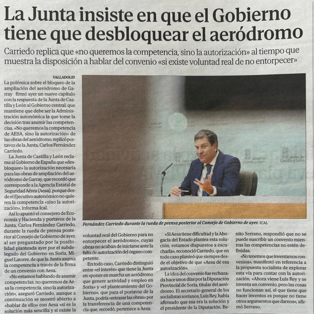 Ese es el procedimiento reglado para el traspaso de competencias. Supone tiempo, reuniones y acuerdos. Pero mientras se traspasan esas competencias que la Junta no quiere asumir, y como le dijo AESA al Luis Rey, basta con un simple convenio entre la junta y AESA, para que la competencia para la autorización de la ampliación de la pista aeródromo de Garray, las asuma AESA, que sería lo más lógico, ya que tiene y ha gestionado todo el expediente. Si la junta tiene realmente interés en poner en marcha un aeródromo que genera actividad y empleo en Soria, lo primero que debería plantearse es si la ubicación es la idónea, si un aeródromo que nace capado y limitado es la mejor opción para el bien de la provincia.
