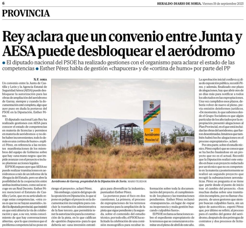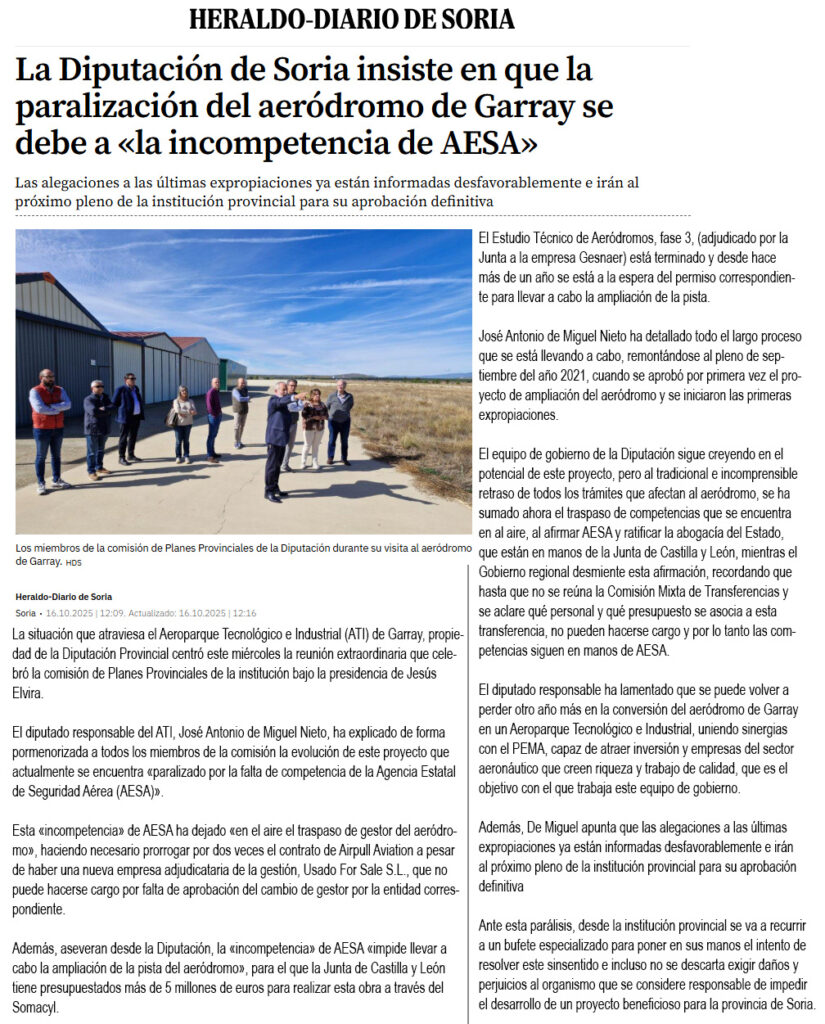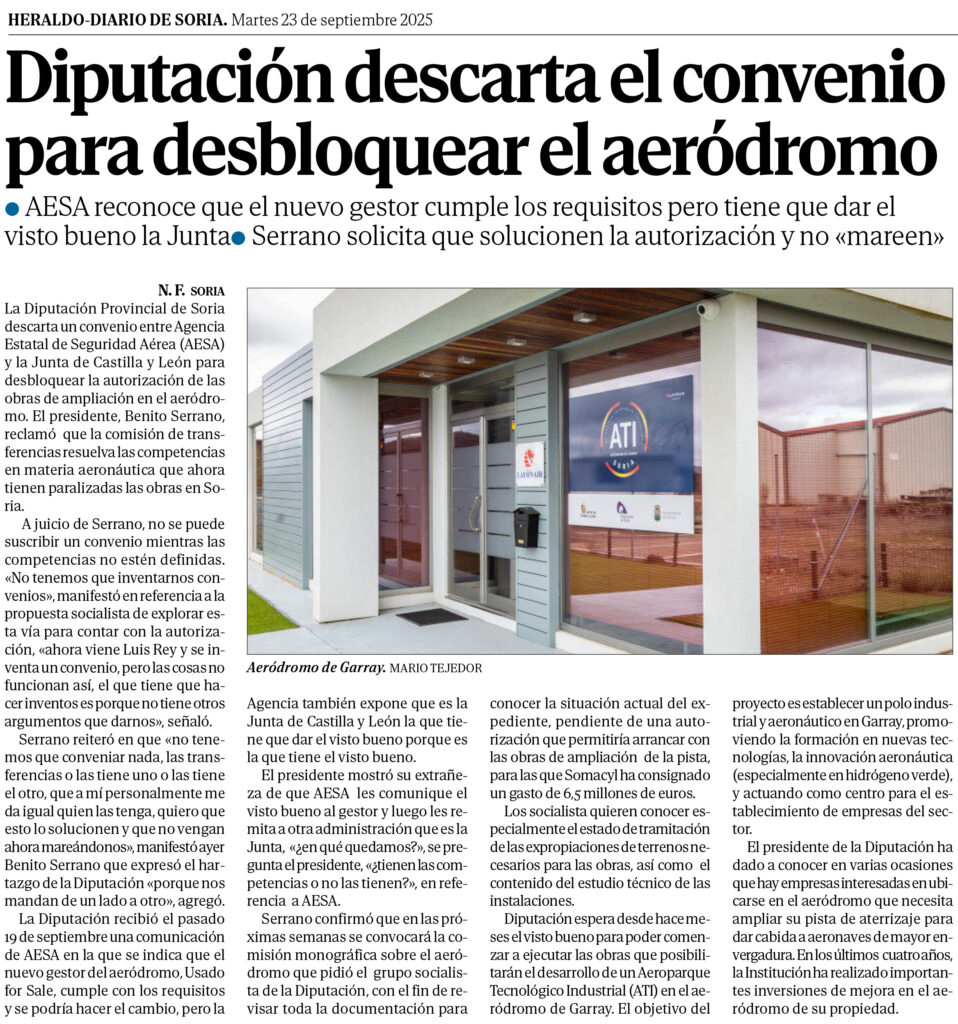 15 de abril de 2025. Sale una noticia en el Heraldo de Soria titula que las obras en el aeródromo están pendientes de negociaciones entre AESA y la Junta.