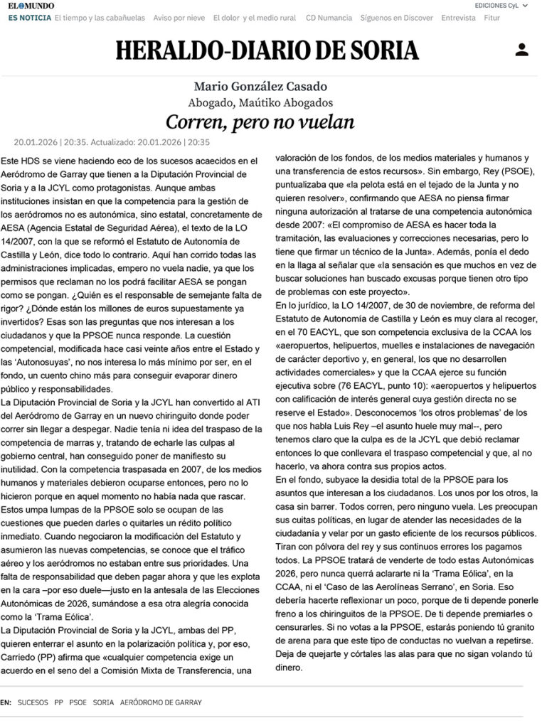 Y lo que no se dan cuenta es que el tema de las competencias no solo afecta al aeródromo de Garray, si no a otros aeródromos e instalaciones de otras Comunidades Autónomas, y si hacen la vista gorda con una (que además ya le han perdonado sus malas gestiones en repetidas ocasiones) lo tienen que hacer con todas. Aquí el victimismo Soriano no va a funcionar.