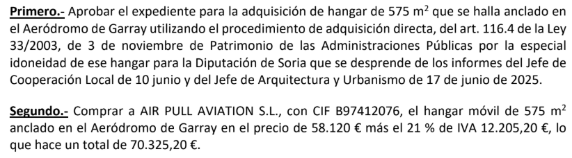Ya he comentado que Diputación le compra a Airpull su hangar. ¿Para qué quiere Airpull un hangar en un aeródromo donde ya no tiene actividad alguna?¿Qué coño hace Airpull con el hangar, si desmontarlo y llevárselo le cuesta más que el propio hangar?. Buena pregunta. Pero tengo otra mejor. ¿Para que quiere Diputación un hangar si solo es propietario, no gestiona nada? Tiene todo concesionado. Las empresas que vengan tendrán que montar sus propias instalaciones. Pero el Presidente y sus amigos me dan la respuesta en el Acta del día 23 de junio del 2025: